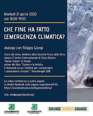 C’è un gran bisogno di trovarsi e confrontarsi, anche a distanza, e cercare insieme di pensare a quale futuro ci aspetta, al termine dell’isolamento: per questo il circolo Legambiente di Pordenone, in collaborazione con Legambiente FVG, ha dato il via a una serie di videoconferenze con al centro l’ambiente e la difesa della salute pubblica. Il tema che verrà affrontato martedì 21 aprile alle 18 in diretta Facebook è l’emergenza climatica, oggi scomparsa dall’agenda mediatica, come se non ci riguardasse più.